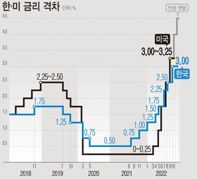 13일 금융시장 등에 따르면 전날 빅스텝을 단행하면서 우리나라(연 3.0%)와 미국(연 3.0~3.25%) 간의 기준금리 격차는 상단 기준으로 종전 0.75%포인트에서 0.25%포인트로 축소됐다.